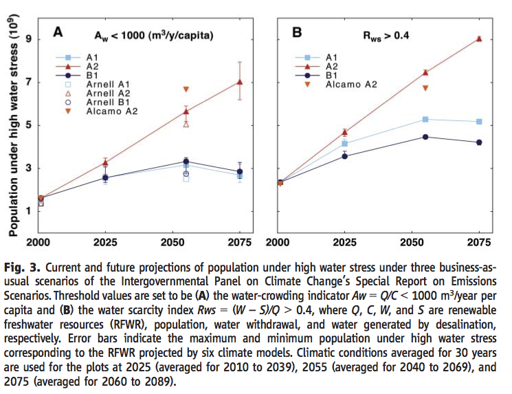 The IPCC cites three sources for figures on the number of people at risk of water stress under various climate scenarios and that extend past 2025 (Vörösmarty et al., 2000 only projects out to 2025), though of the three only Arnell 2004 explicitly compares scenarios with and without climate change to attempt to identify its impact:[10] IPCC AR4 3.5.1