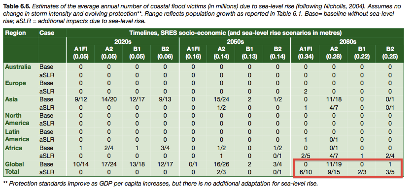 Average annual number of coastal flood victims in millions (and sea level rise in meters)[28] AR4 WGII Table 6.6 The table in the main text combines the “Base” and “aSLR” rows into the the “With CC” row. The estimate of 10 million people flooded in 1990 comes from Nicholls, 2004, which is the underlying source for the IPCC table shown above: “In 1990, it is estimated … Continue reading