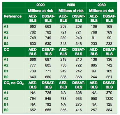 Note that this table gives absolute numbers of people at risk of hunger. Across all scenarios, the impact of climate change on hunger is negative (i.e. climate change leads to more hunger). However, expected socio-economic growth plays a large role in the level of vulnerability: in three of the four scenarios considered, hunger declines substantially by 2080 relative to 2000, both with and without the effects of climate change; in A2, which features slow economic growth and fast population growth, the number of people at risk of hunger in 2080, taking into account the effects of climate change, is essentially the same as in 2000. Across all scenarios, hunger is expected to decline as a proportion of the population.[4]Comparing the figures in the chart to the total population yields the following proportions of the total population that is at risk of hunger: 2000 Actual: 824 million at risk of hunger / ~6 billion population = 13.7% 2080 projected: A1: 136 million at risk of hunger / 8.1 billion population … Continue reading